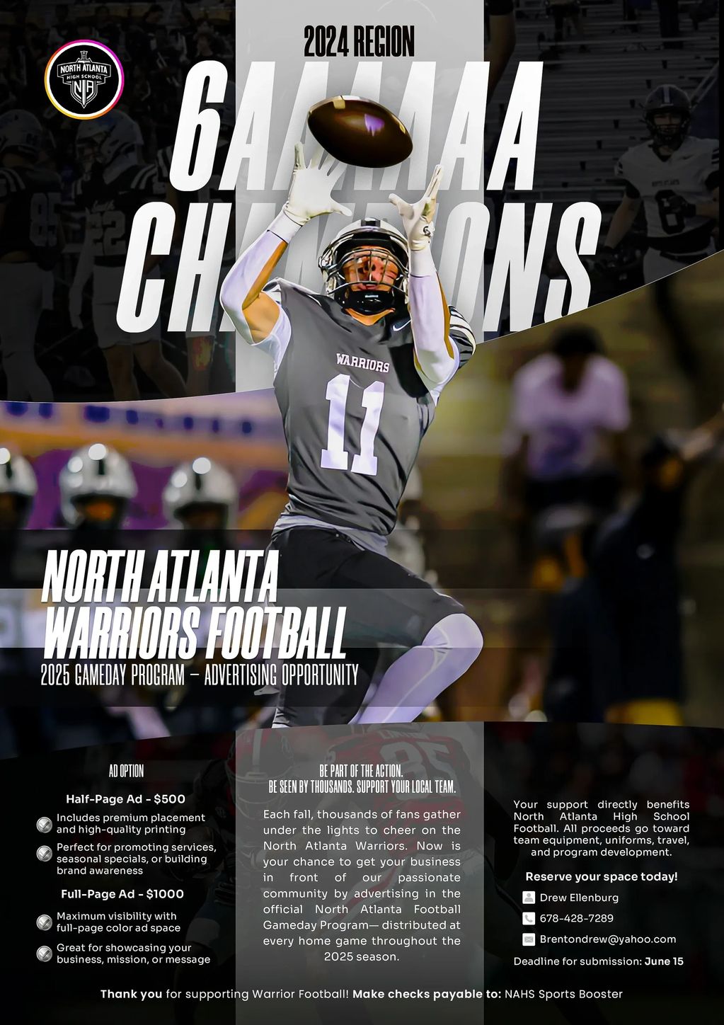 Each fall, thousands of fans gather together under the lights to cheer on the North Atlanta Warriors. Now is your chance to get your business in front of our passionate community by advertising in the official North Atlanta Football Game Day Program - sold at home games throughout the 2026 season.